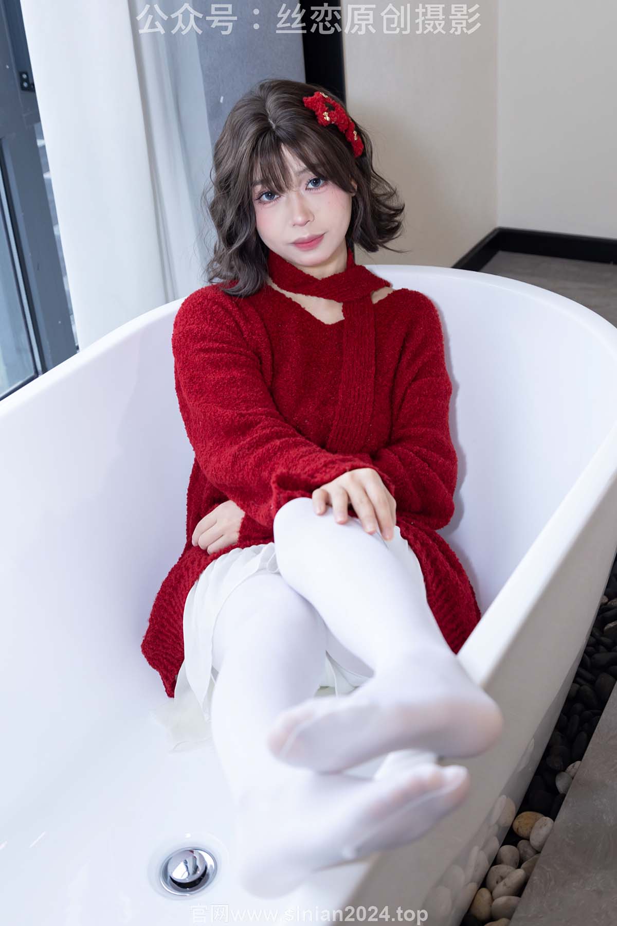 丝恋摄影 NO.010 泡芙-红色毛衣 小白裙 厚白丝袜 白色板鞋
